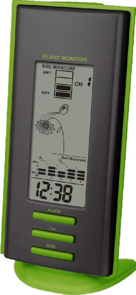 Метеостанция "Uniel UTV-63" предназначена для контроля за влажностью почвы и состоит из главного блока и беспроводного датчика влажности, устанавливаемого у корней растения. Текущая влажность почвы выводится прибором на встроенный дисплей, при необходимости полива (нижний порог влажности устанавливается) на этом же дисплее появляется соответствующая пиктограмма. Может поддерживать работу с пятью датчиками одновременно (в комплекте 1). Есть часы с будильником, питается от батареек.