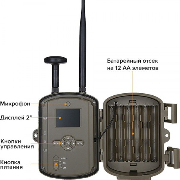 SMS контроль. Камерой можно дистанционно управлять через SMS команды из любой точки планеты, однако нужно учитывать, что находясь в режиме ожидания SMS команд, ловушка будет потреблять гораздо больше энергии.